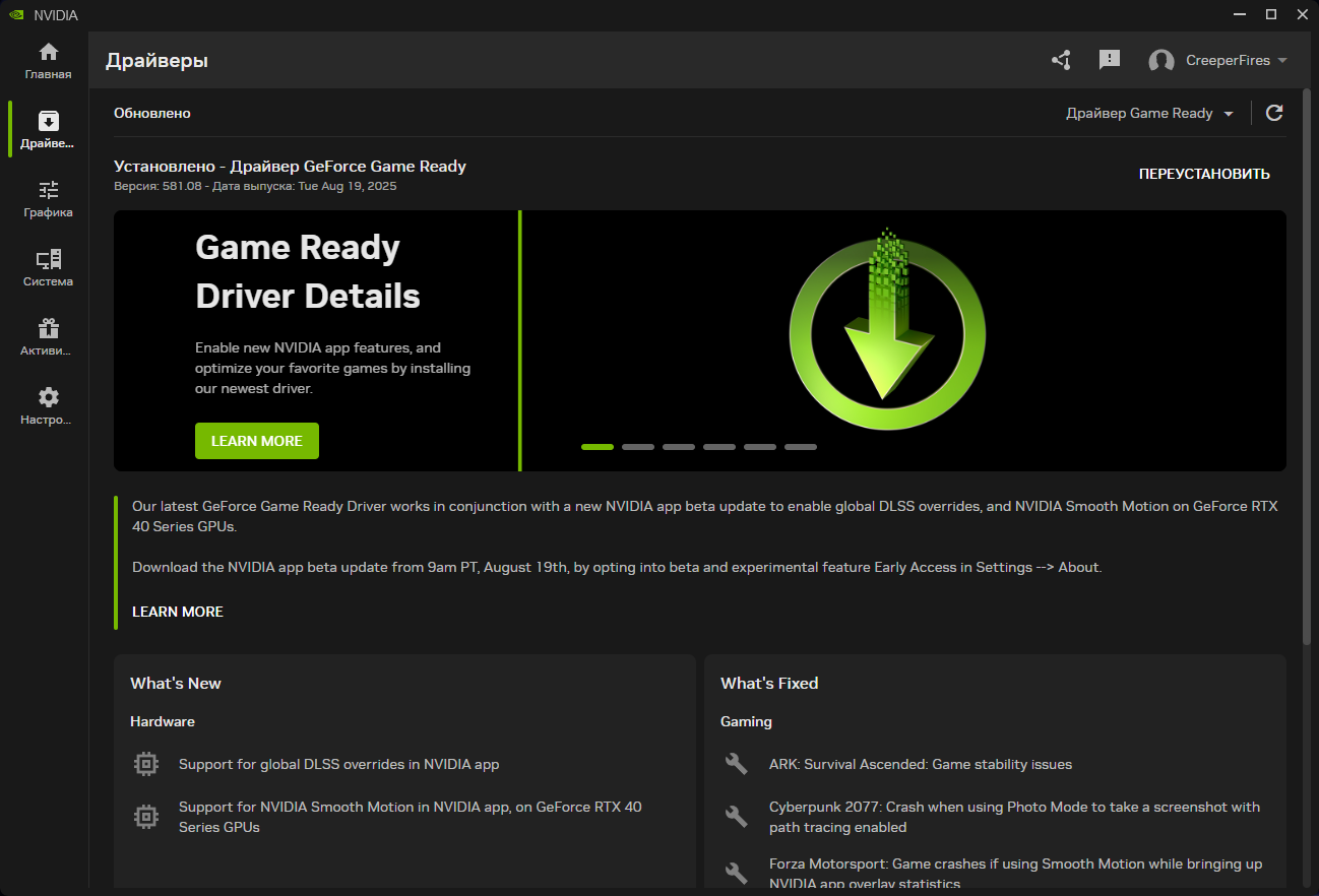 Этот драйвер синхронизирован с последним бета-обновлением NVIDIA App и раскрывает его ключевые функции для геймеров. Установка версии 581.08 WHQL обязательна, если вы хотите опробовать глобальное замещение DLSS и новую технологию Smooth Motion на видеокартах RTX 40.