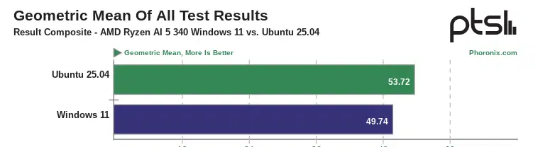 По итогам десятков кроссплатформенных и нативных бенчмарков среднее преимущество Ubuntu составило около 8% (геометрическое среднее) по сравнению с Windows 11.