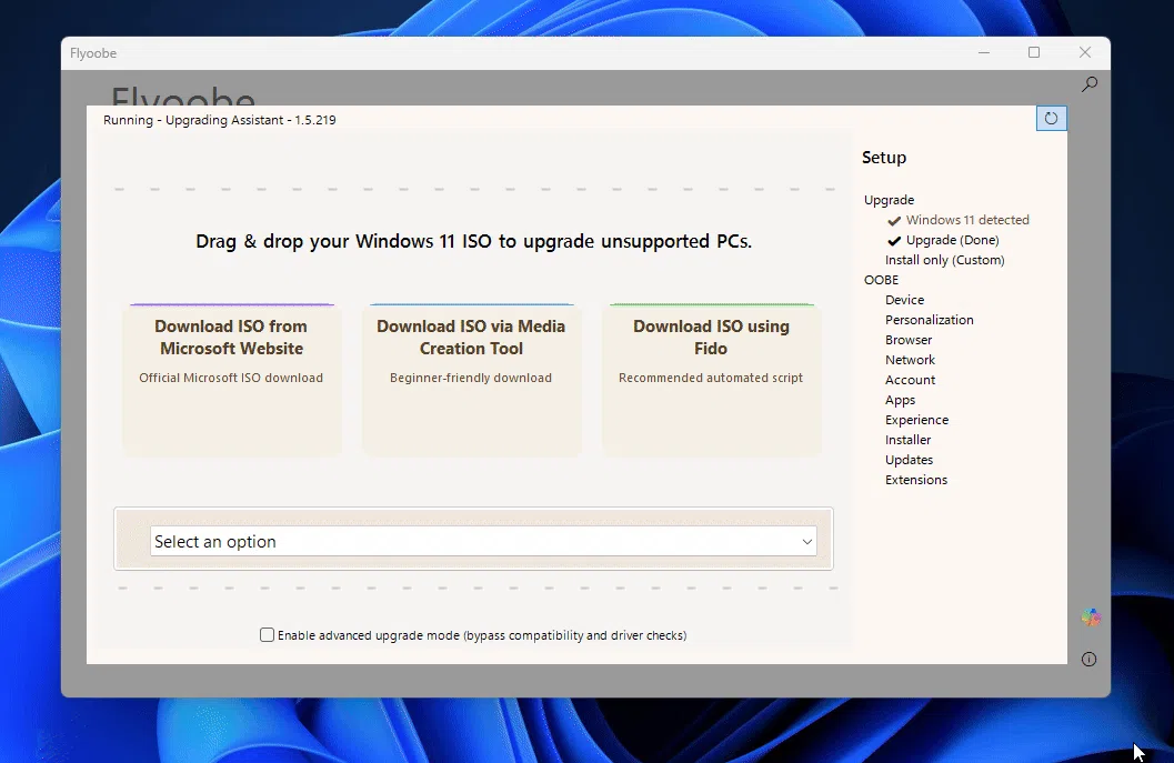 Flyoobe упрощает установку и первичную настройку Windows (OOBE) — от обхода аппаратных ограничений до тонкой конфигурации с первого запуска. Инструмент объединяет ключевые сценарии: чистая установка, ремонт системы, твики, «облегчение» системы от лишних компонентов и многое другое.