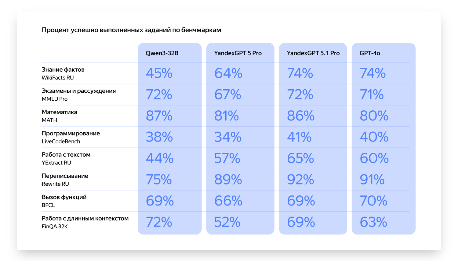 - Больше точных ответов. По внутренним сравнениям YandexGPT 5.1 Pro выигрывает у предыдущей версии в 58% кейсов и опережает GPT-4.1 в 56% случаев.
