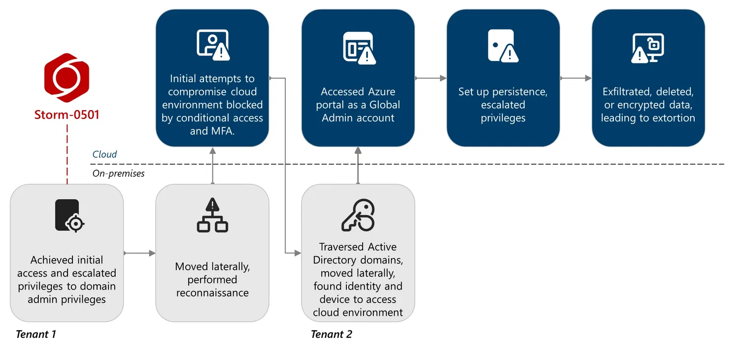 Компания Microsoft предупреждает, что киберпреступная группировка Storm-0501 изменила тактику: вместо шифрования конечных устройств с помощью программ-вымогателей теперь основной упор делается на облачное шифрование, кражу данных и вымогательство.