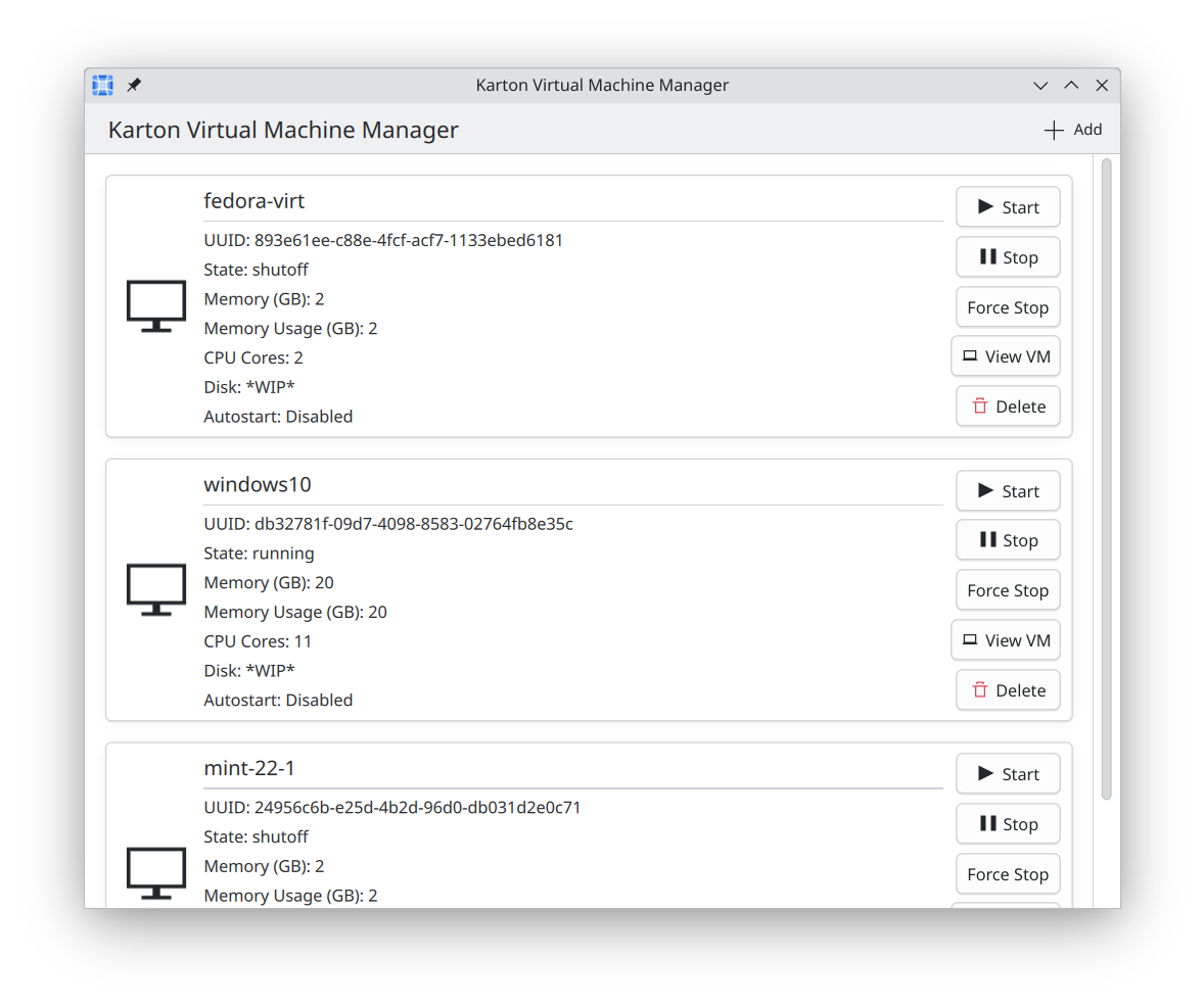Karton создается как альтернатива существующим GTK-решениям для управления виртуальными машинами в Linux, включая GNOME Boxes и virt-manager. Проект пока находится в стадии разработки и не обладает полным набором функций.