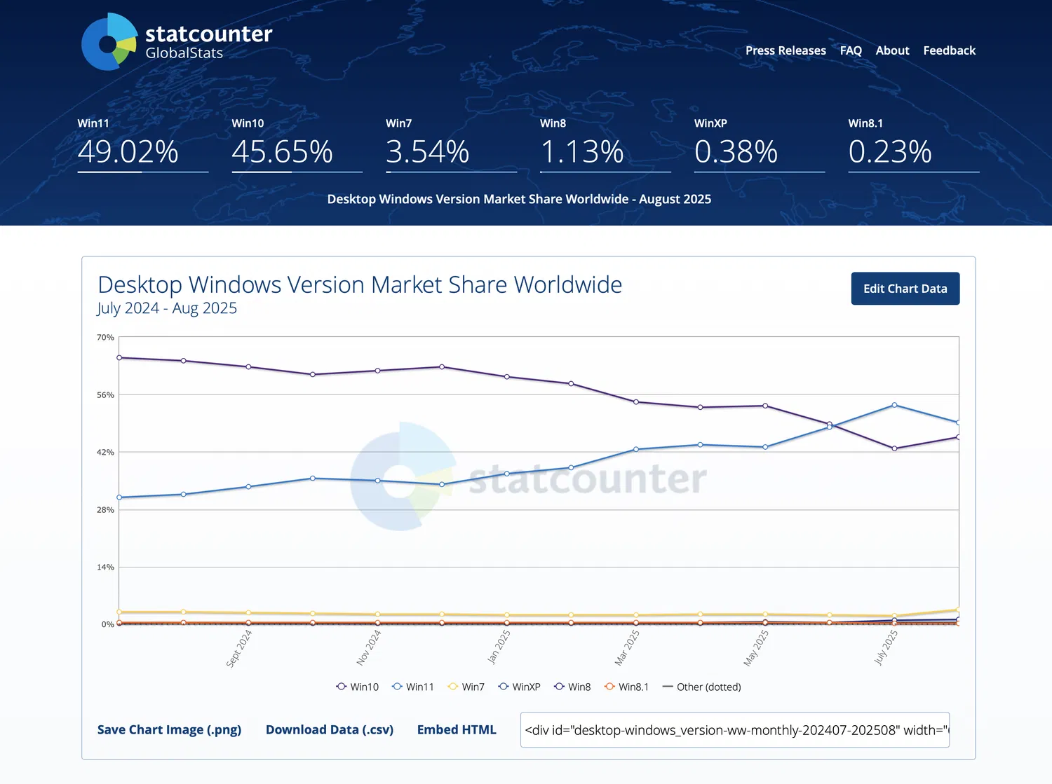 По состоянию на 1 сентября 2025 года Windows 11 занимает долю рынка в 49,02% (-4,49%), Windows 10 идет второй с результатом 45,65% (+2,77%). Остальная доля делится между давно устаревшими Windows 7, Windows 8.1, Windows 8 и даже Windows XP. Несмотря на 11 лет без поддержки, некоторые пользователи все еще выходят в интернет с компьютеров на базе XP.