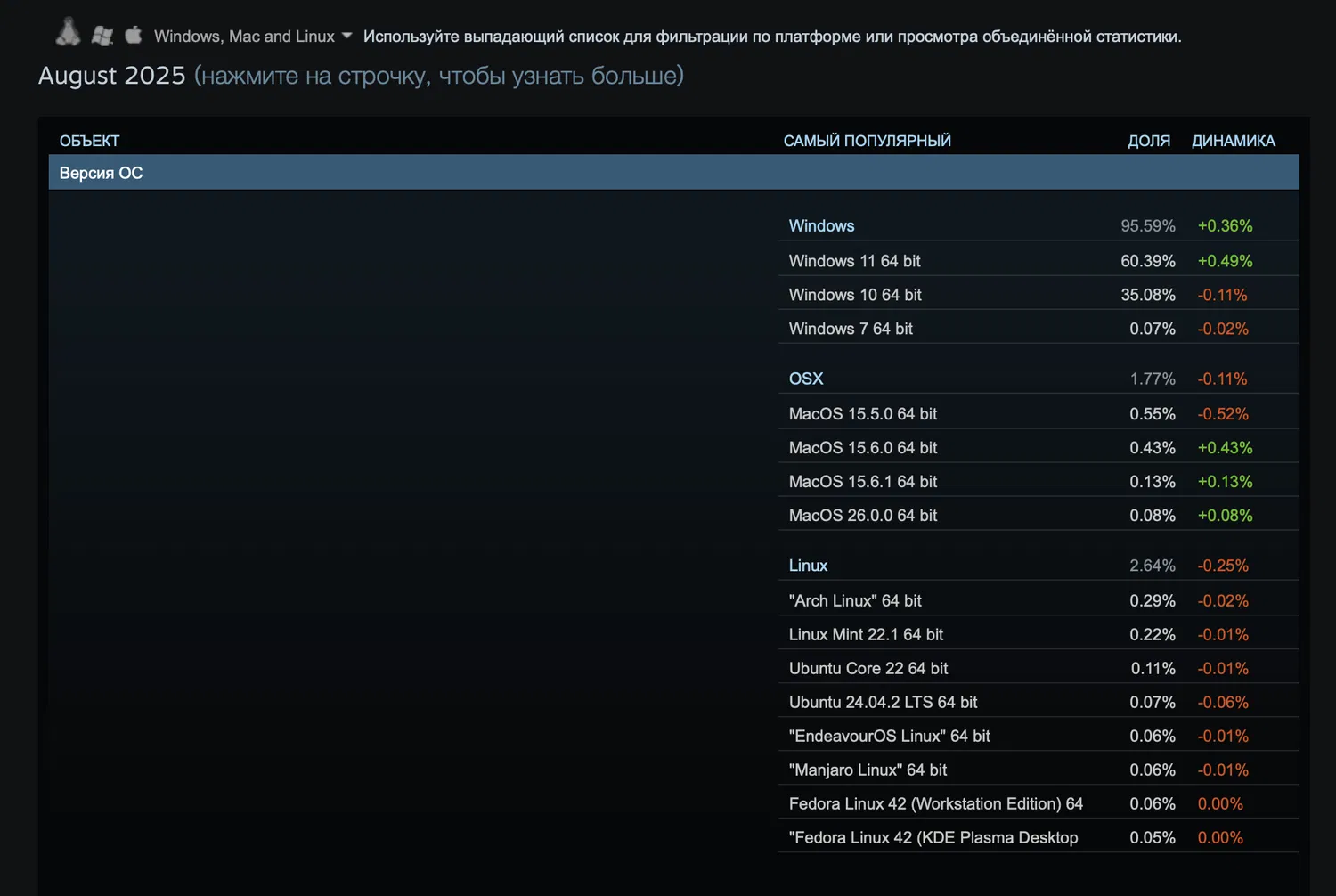 По данным Steam Survey, Linux в августе занял 2,64% рынка, потеряв 0,25% по сравнению с июлем. macOS также снизил показатель на 0,11% до 1,77%, тогда как Windows укрепил позиции, прибавив 0,36% и достигнув 95,59%.