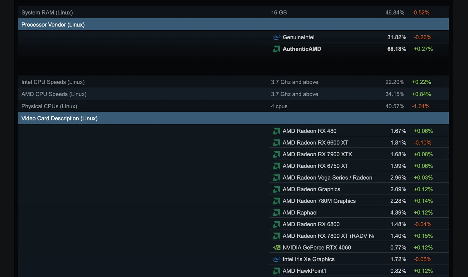 Из-за того, что Steam Deck использует кастомный APU от AMD, а также благодаря открытым драйверам и высокой совместимости, процессоры AMD продолжают доминировать среди Linux-геймеров. Доля компании составляет почти 70% от всех систем на Linux в Steam.