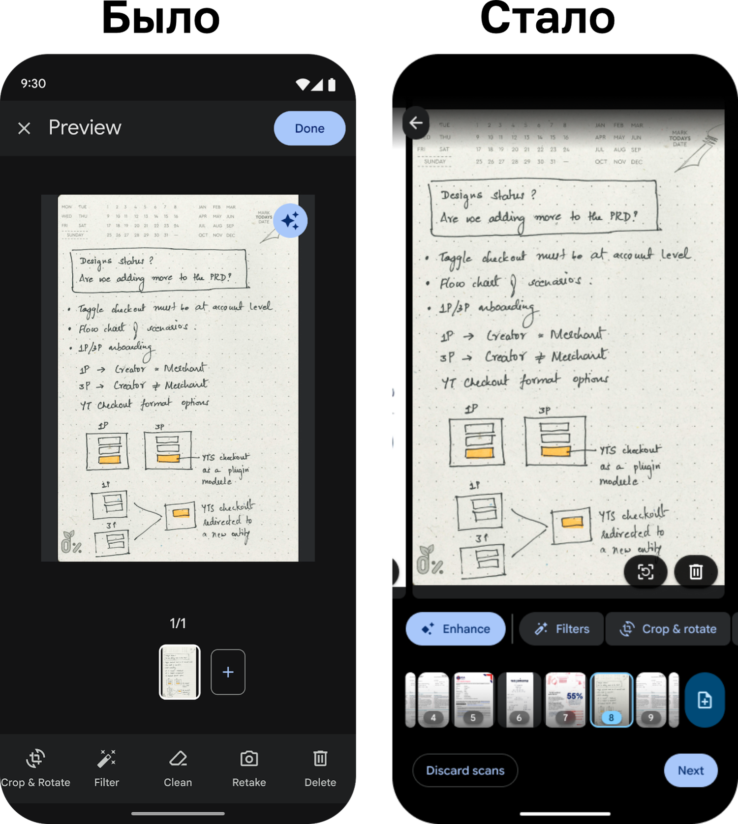 Кроме того, Google обновил расположение элементов интерфейса, упростив поиск кнопки для удаления страницы или повторного снимка документа. Обновленная карусель миниатюр позволяет быстро пролистывать документ и менять порядок страниц с помощью перетаскивания (drag-and-drop).