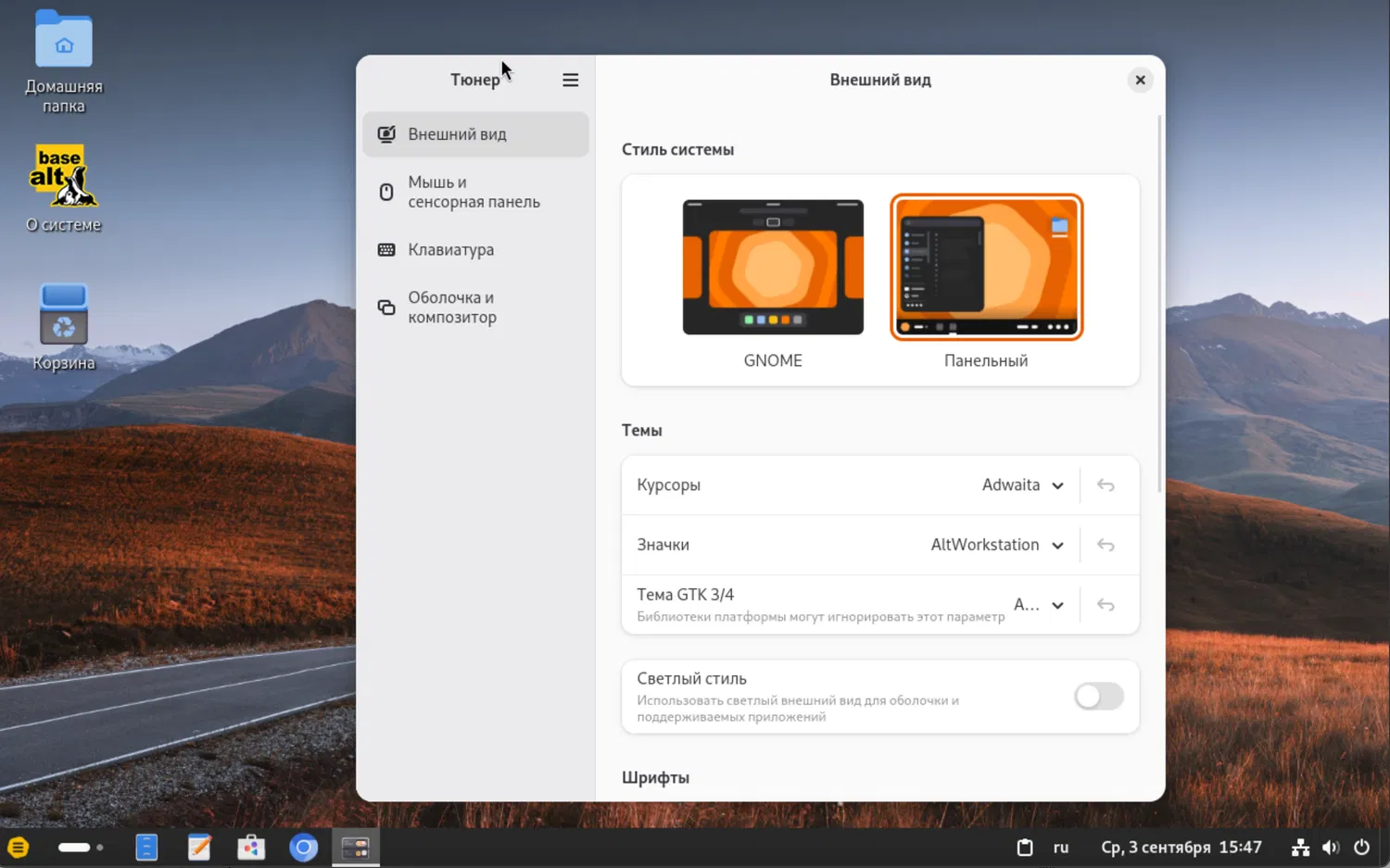 Разработчики ALT Linux Team интегрировали в систему Тюнер — центр дополнительных параметров. Здесь доступно переключение между профилями оформления («Панельный» и GNOME), а также появилась поддержка дробного масштабирования с шагом 25 % для разных мониторов.