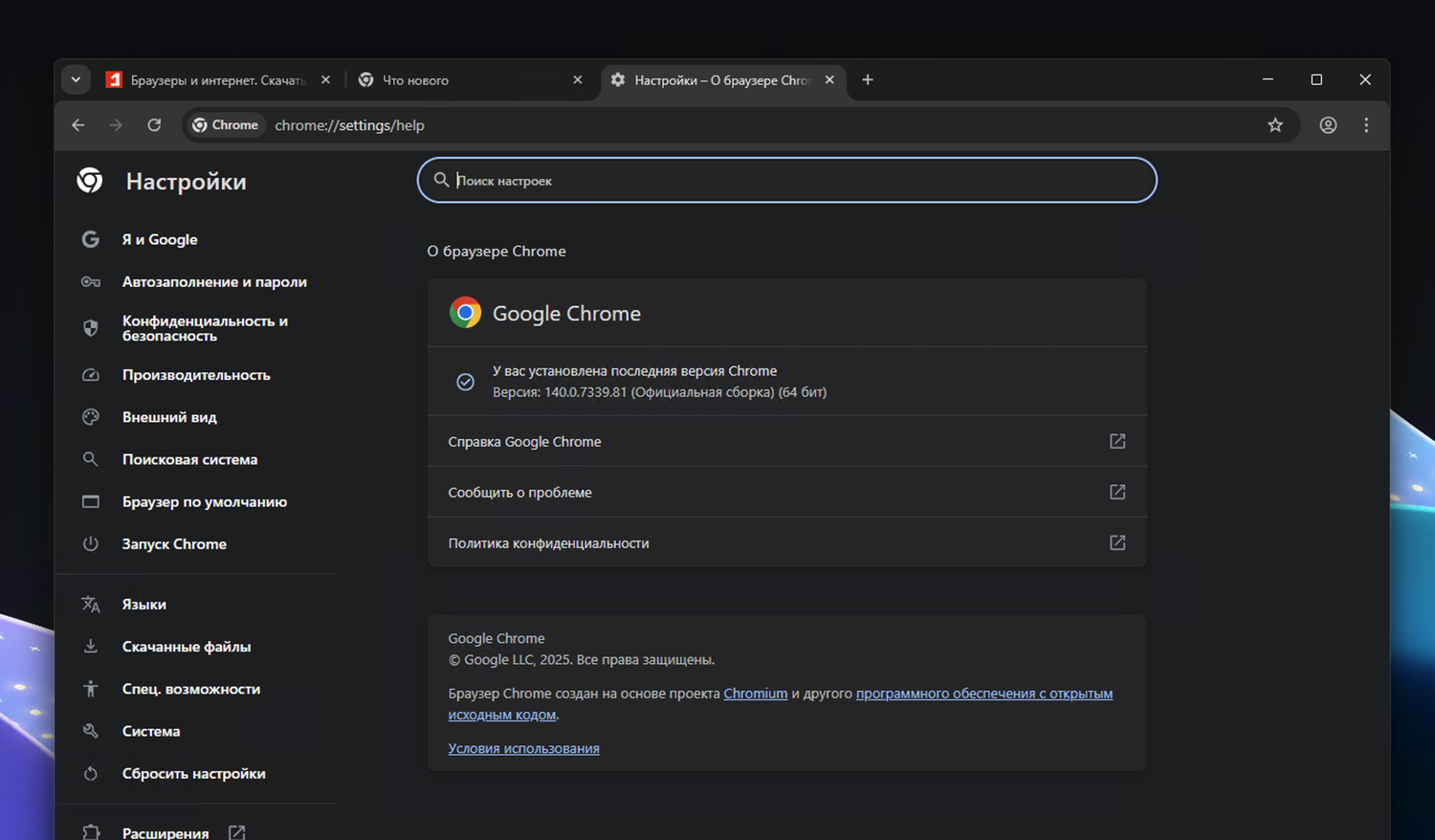 Чтобы проверить версию Google Chrome, перейдите в меню > Справка > О браузере Google Chrome или откройте страницу chrome://settings/help. Если обновление доступно, то браузер автоматически скачает и установит свежую версию. Для завершения установки обновления потребуется перезапуск браузера.