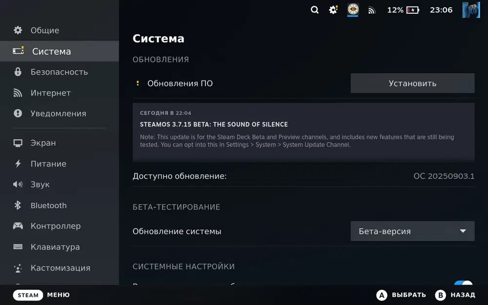 Чтобы попробовать новую версию на Steam Deck или другом совместимом устройстве, необходимо переключиться на канал Beta (Бета-версия) или Preview (Ранняя сборка) в меню Настройки > Система > Бета-тестирование.