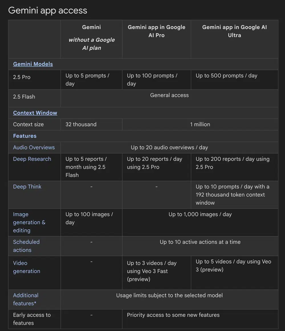 До этого момента Google ограничивалась размытыми формулировками вроде «limited», «expanded» и «highest access». Теперь же компания опубликовала конкретные цифры на странице поддержки, где подробно указаны ограничения по использованию Gemini для разных категорий пользователей.