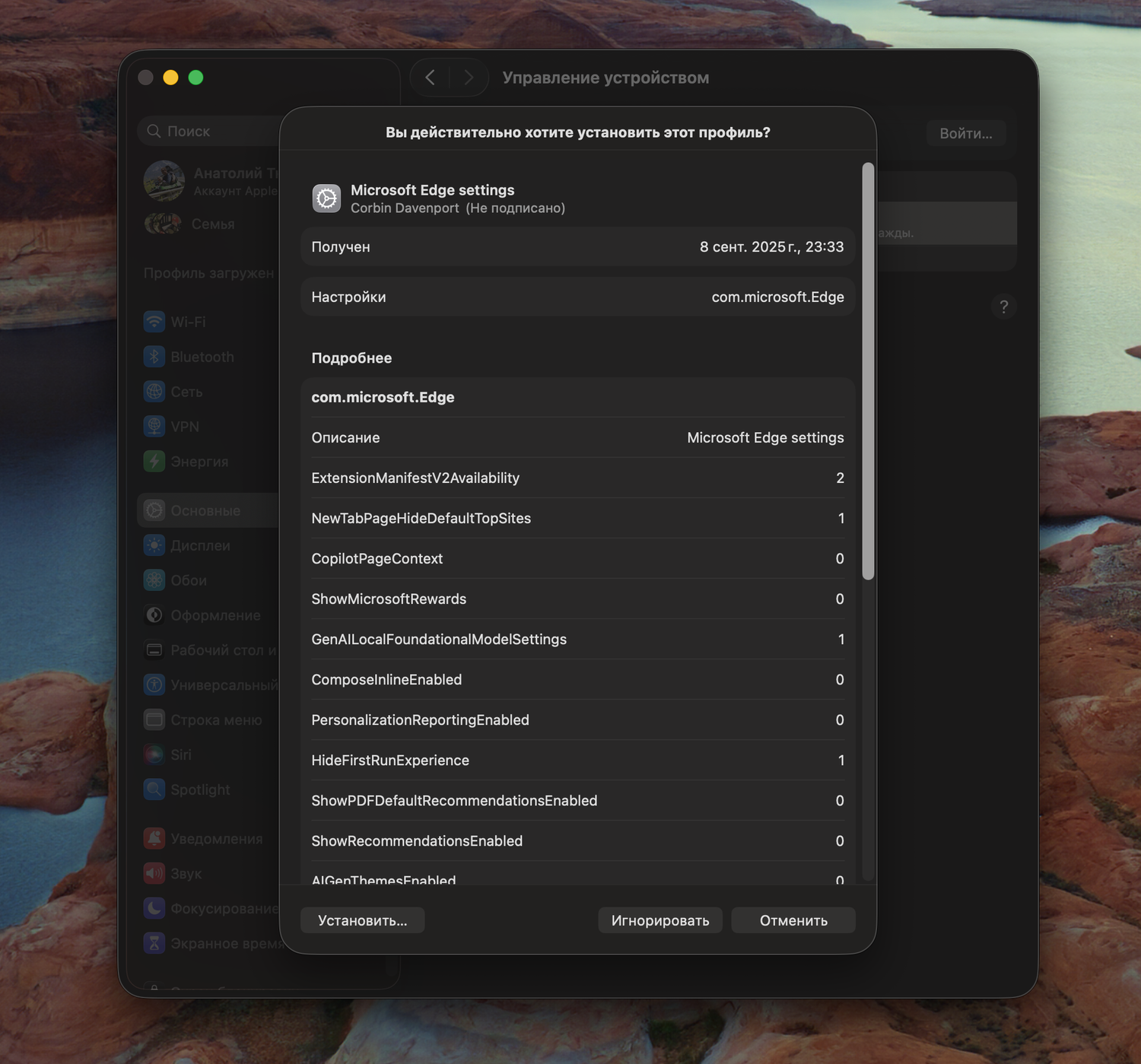 Сохранив .mobileconfig и открыв его через Finder, macOS предложит установить его как новый профиль (раздел Системные настройки > Основные > Управление устройством). Достаточно начать установку профиля, пройти предупреждения системы – и Edge получит нужные политики.