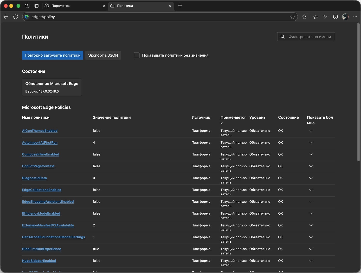 Чтобы изменения вступили в силу, перезапустите браузер Edge. Проверить, применились ли политики, можно на странице edge://policy – если в столбце "Состояние" для каждого пункта указано «OK», значит, всё сработало. На скриншоте ниже показан пример страницы edge://policy со списком настроек и их значениями после установки профиля.