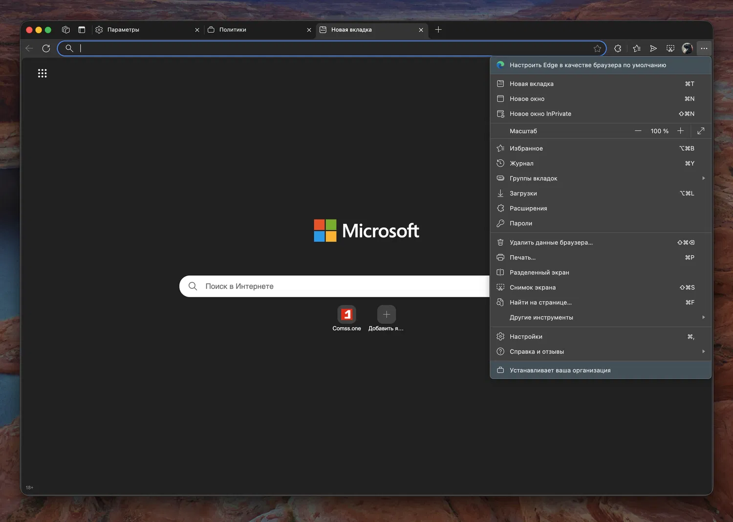 После всех этих изменений Edge предстал в совершенно ином виде. При запуске на Mac появилась минималистичная страница новой вкладки – без рекомендованных новостей, без спонсорских ссылок и даже без кнопки боковой панели. В меню браузера отображается пометка «Устанавливает ваша организация» (в Настройках – «Управляет ваша организация»), поскольку Edge распознаёт применённые политики как корпоративные. Некоторые из вышеперечисленных опций можно было и так отключить вручную, но Дэвенпорт предположил, что если зафиксировать их через политики, настройки больше не будут самопроизвольно сбрасываться. По состоянию на сегодня всё остаётся так, как было настроено.