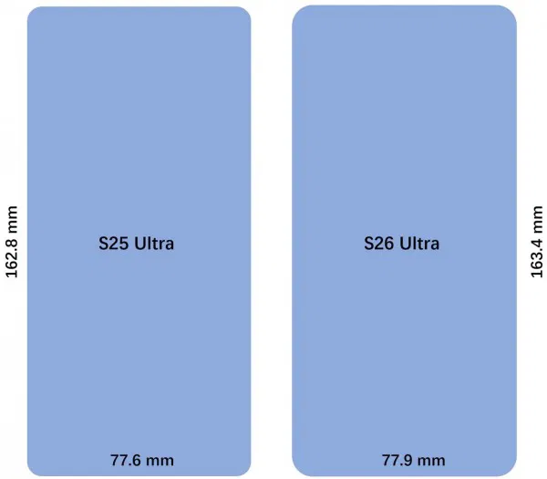 Galaxy S26 Ultra станет немного крупнее по сравнению с предшественником. Высота составит 163,4 мм, ширина — 77,9 мм, что на 0,6 мм выше и на 0,3 мм шире, чем у Galaxy S25 Ultra. При этом толщина корпуса в самой тонкой части уменьшится с 8,2 мм до 7,9 мм.