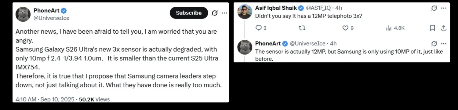 Ожидаемый флагман Samsung Galaxy S26 Ultra, согласно утечке от инсайдера Ice Universe, может получить менее производительную 3-кратную камеру по сравнению с Galaxy S25 Ultra. Речь идёт о сенсоре с меньшими физическими параметрами, что потенциально снижает качество фотографий в портретном режиме и при использовании 3-кратного зума.