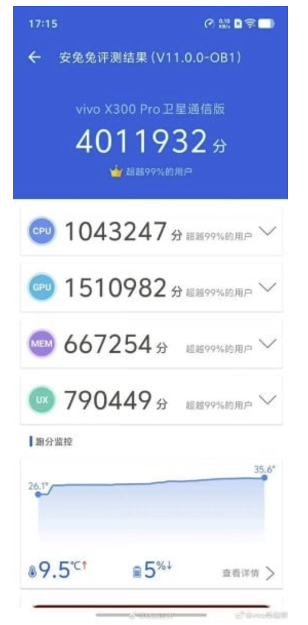 В бенчмарке AnTuTu v11 Vivo X300 Pro набрал 4 011 932 балла. Из них 1 043 247 пришлись на производительность CPU, а 1 510 982 — на GPU. Процессор Dimensity 9500 построен на архитектуре из восьми производительных ядер: четыре Cortex-X930 и четыре Cortex-A730. Конфигурация полностью состоит из ядер высокого класса. Vivo также подтвердила сотрудничество с Arm, указав на поддержку набора инструкций SME2.