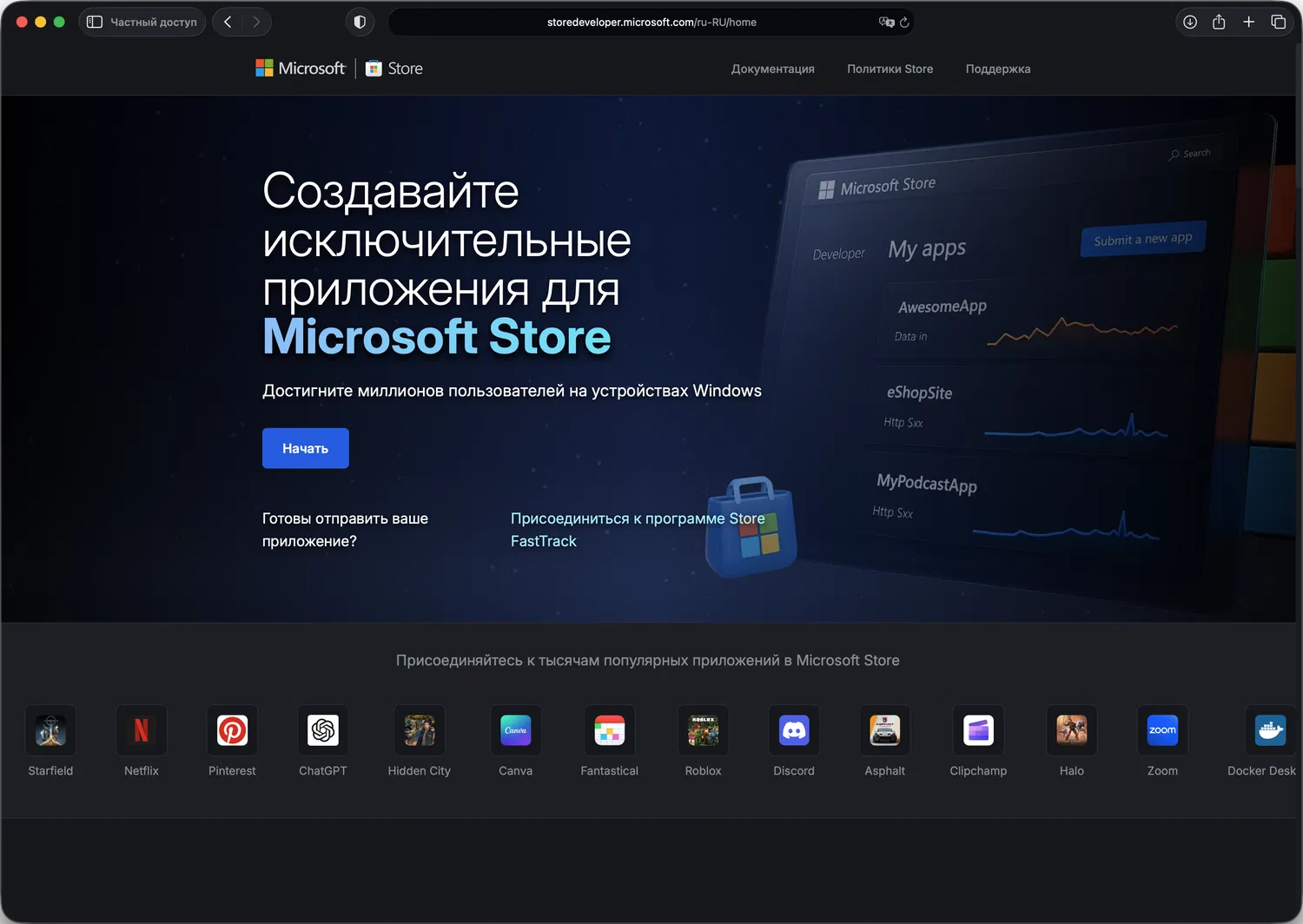 Зарегистрироваться в качестве разработчика в Microsoft Store можно на портале Платформа разработчиков Microsoft Store.