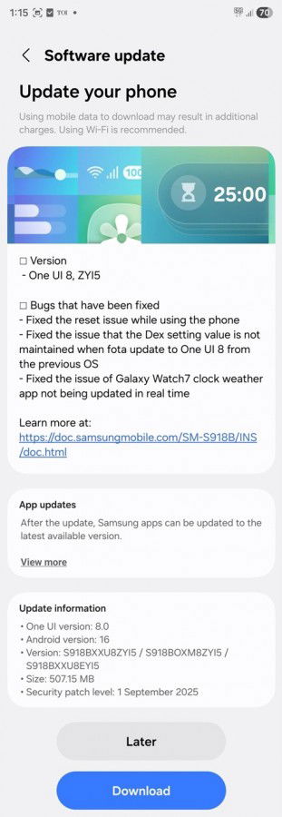 Размер обновления составляет около 500 МБ; оно включает сентябрьский патч безопасности Android 2025 года, а также несколько исправлений ошибок (например, устранена проблема со случайными перезагрузками устройства и сбросом настроек Samsung DeX при обновлении прошивки).