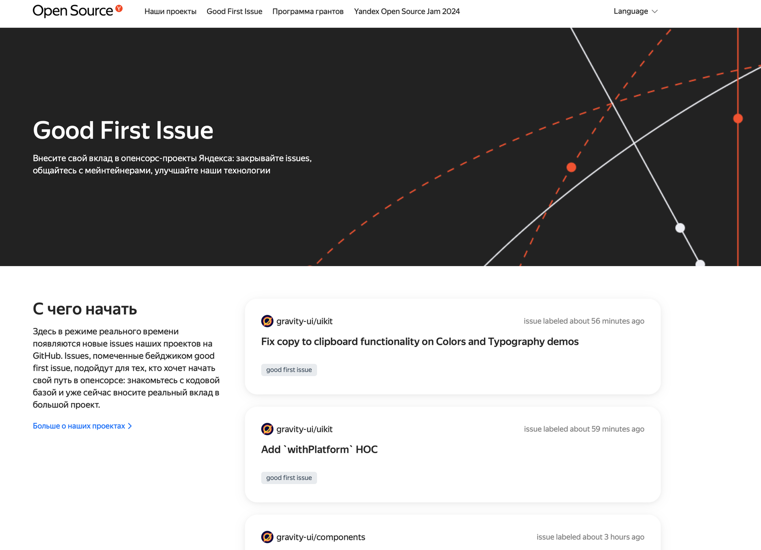Yandex Open Source запустил Good First Issue — специальную страницу, которая объединяет входные запросы на улучшения (issues) всех открытых проектов компании. Теперь разработчикам, которые хотят внести свой вклад в опенсорс-проекты Яндекса, будет проще найти подходящую задачу и начать работу.
