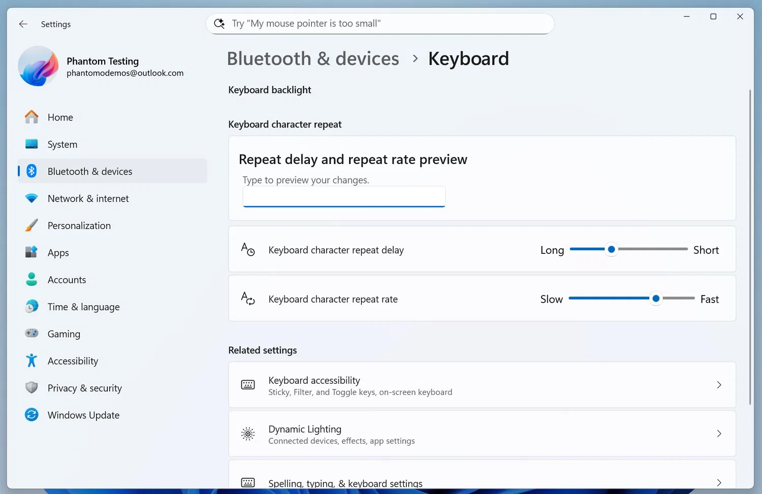 На скриншотах видно, что страница «Клавиатура» появится в разделе «Bluetooth и устройства». Там будут размещены параметры подсветки клавиатуры и настройки повтора символов (перенесенные из «Панели управления»).