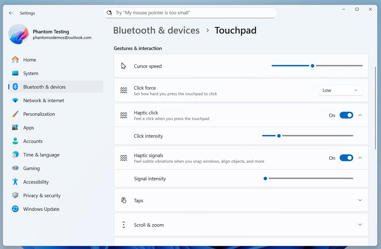 Кроме того, Microsoft вносит изменения в раздел тактильной сенсорной панели, добавив несколько переключателей. Например, настройка чувствительности теперь представлена раскрывающимся списком, а тактильные нажатия или сигналы — двумя отдельными ползунками и переключателями.