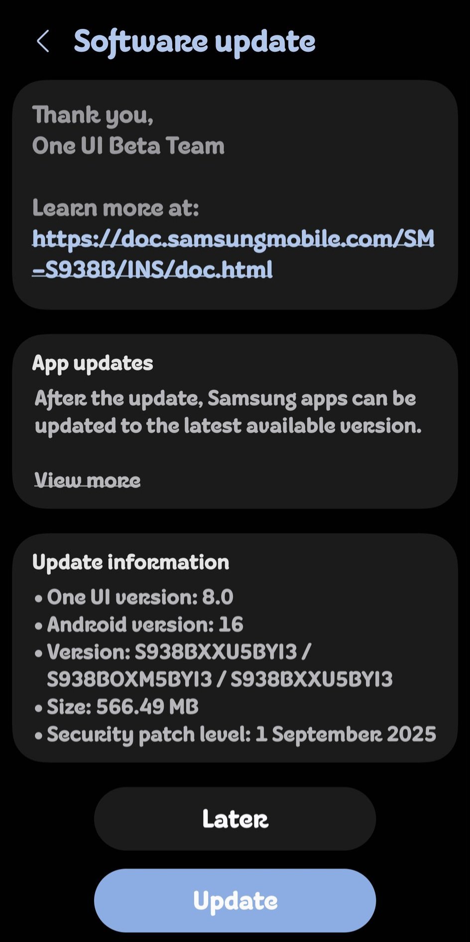 Важно отметить, что пока обновление доступно только для тех устройств, которые участвовали в бета-тестировании One UI 8. Прошивка имеет номер S93xBXXU5BYI3, включает патч безопасности Android от 1 сентября 2025 года и весит около 565 МБ.