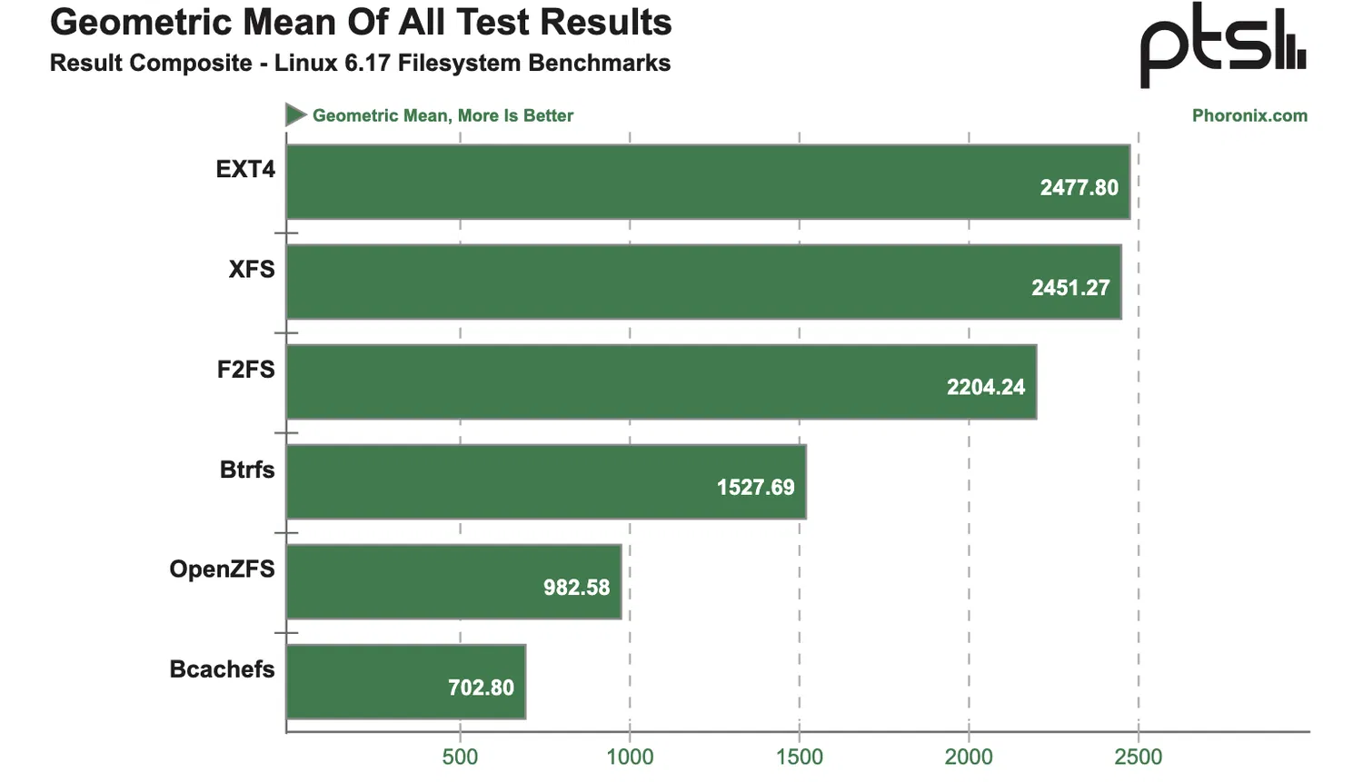 Результаты, полученные при вычислении среднего геометрического показателя всех тестов, показали, что EXT4 продемонстрировала незначительное, но уверенное превосходство над XFS, заняв первое место. Подобный результат, вероятно, обусловлен улучшениями, которые были интегрированы в EXT4 в этом цикле разработки. F2FS заняла третье место, значительно отстав от лидеров. За ней следовали файловые системы Btrfs и OpenZFS, а Bcachefs показала наихудший результат. Следует отметить, что тестирование Bcachefs проводилось в ее текущем состоянии в ядре Linux 6.17. В дальнейшем планируется оценить производительность Bcachefs DKMS, когда это станет возможным.