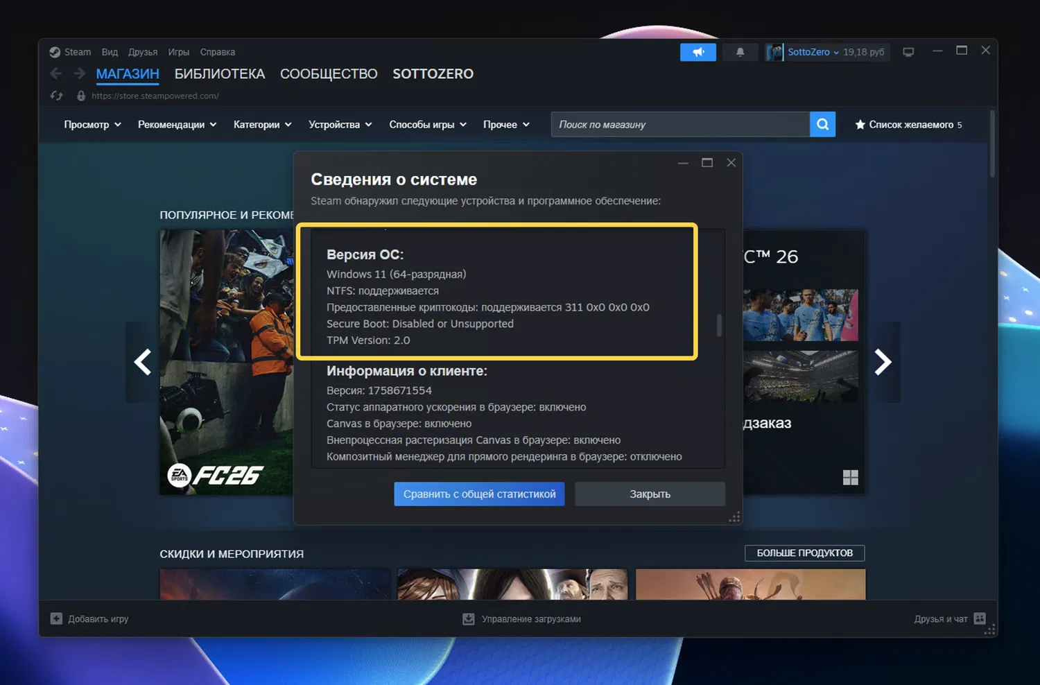 Если открыть Steam, перейти в меню Справка и выбрать пункт Сведения о системе, вы увидите длинный список характеристик вашего компьютера. Нужно лишь пролистать вниз до раздела Версия ОС— там появится строка Secure Boot, которая покажет, включена ли функция. Это упрощает жизнь геймерам, которым и без того приходится разбираться в массе технических деталей, и позволяет быстро убедиться, что у них все в порядке. Заодно здесь же отображается и статус TPM — еще одного важного механизма безопасности Windows 11 и обязательного требования для ее официальной совместимости с оборудованием.