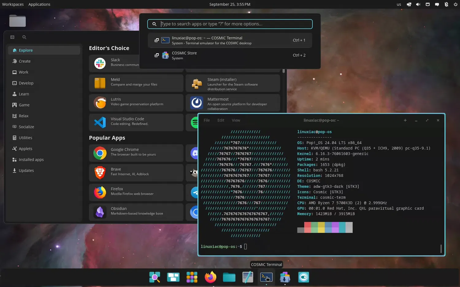 Основные приложения COSMIC уже интегрированы. В их число входят Settings (Настройки), Files (Файлы), Store (Магазин), Terminal (Терминал), Edit (Редактор) и Player (Плеер). Апплеты, встроенные в панели, обеспечивают быстрый доступ к ключевым функциям, таким как управление сетью, звуком, уведомлениями и функциями доступности. Дополнительные апплеты можно установить из COSMIC Store.