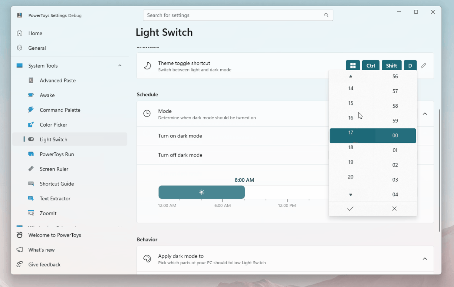 Следующее обновление PowerToys — версия 0.95, ожидаемая в следующем месяце, принесет модуль Light Switch. Его задача проста: переключать темы Windows по пользовательскому расписанию или в зависимости от времени восхода/заката.