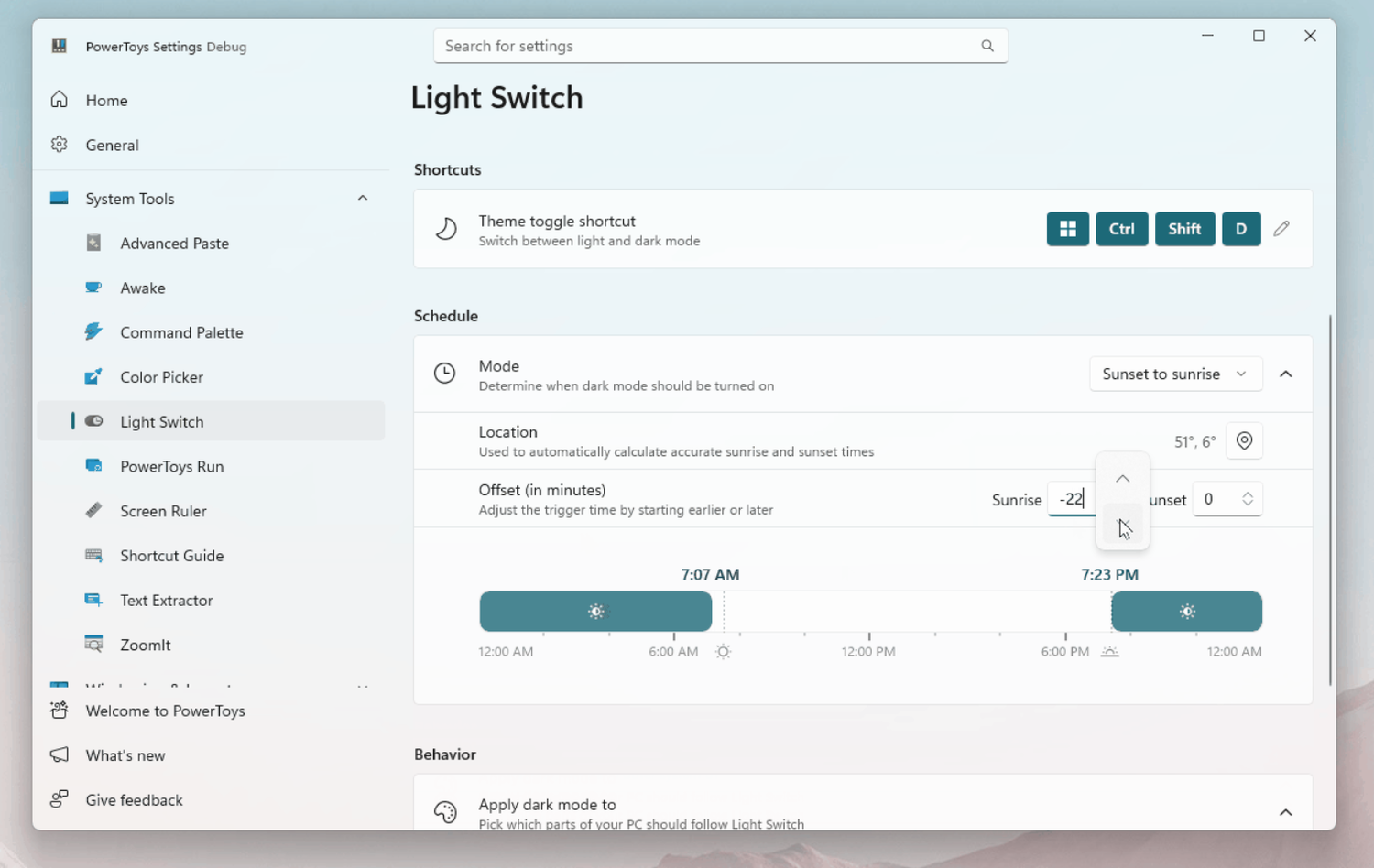 В Light Switch можно будет настроить, когда Windows должна переходить из темной темы в светлую и обратно. Можно указать свои часы или привязать переключение к геопозиции (восход/закат). Более того, Microsoft добавит возможность задавать смещение — например, включать темную тему за час до заката.