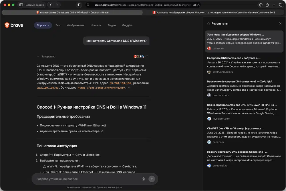 Благодаря «Спросите Brave» пользователям больше не нужно выбирать разные инструменты в зависимости от задачи, переключаться между традиционным поиском с его «десятью синими ссылками» и чат-интерфейсами с огромными стенами текста.