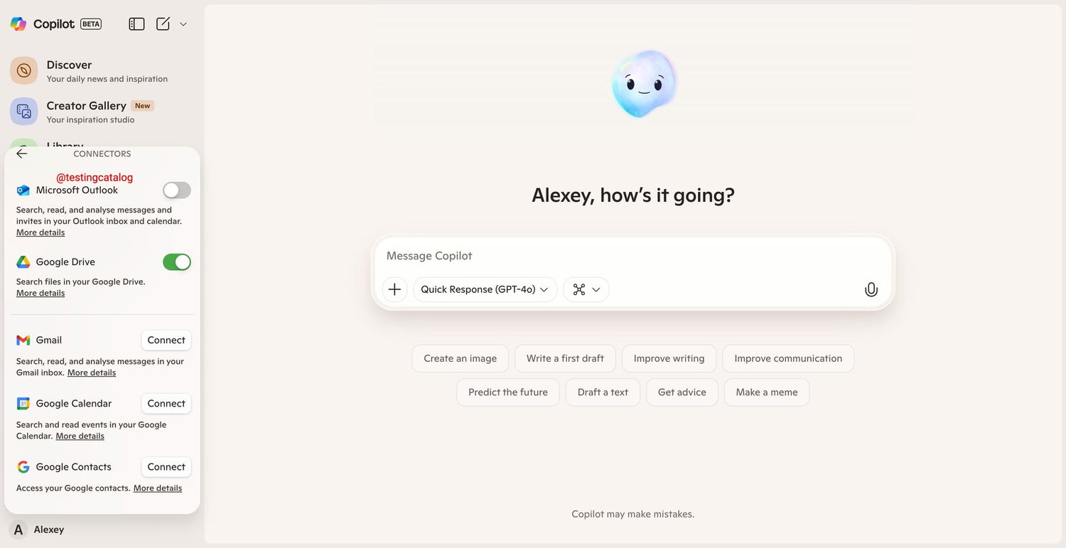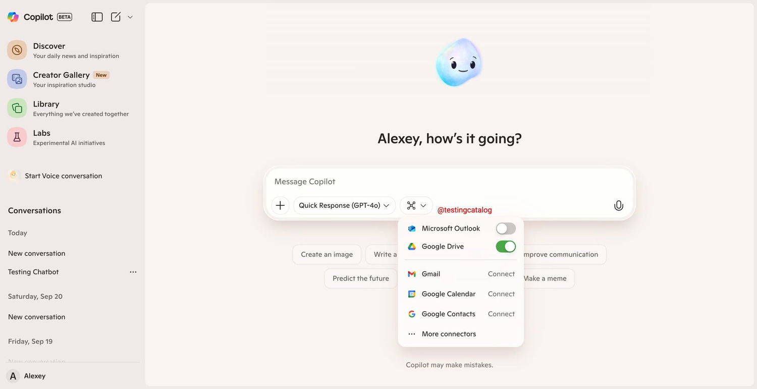 В Copilot появятся коннекторы, позволяющие интегрировать данные из различных источников. Уже доступен скрытый ранее коннектор для Google Drive, а в интерфейсе начали отображаться селекторы для подключения других сервисов.