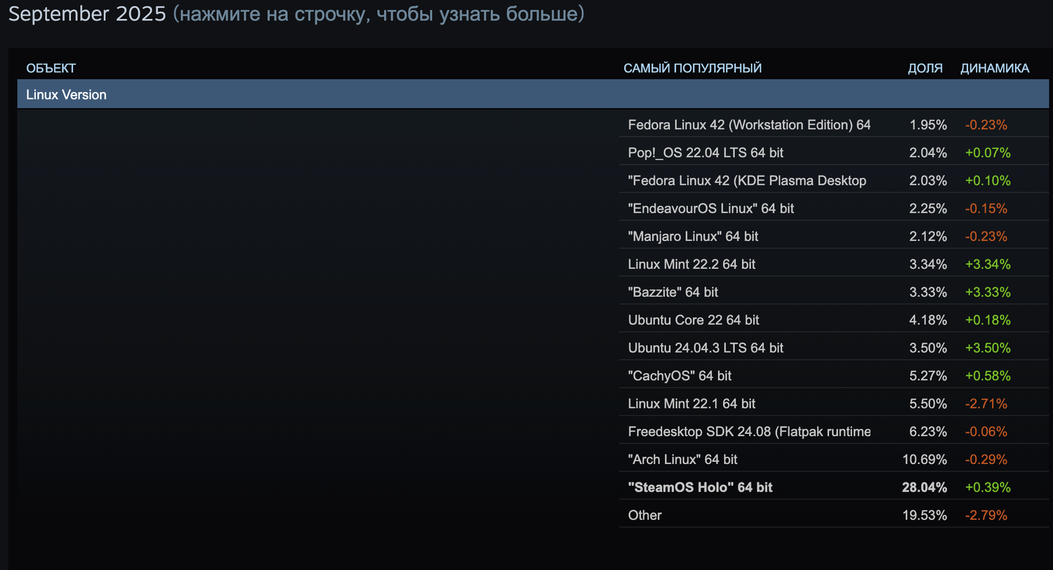 Среди самой аудитории пользователей Linux, данные сентября не претерпели существенных изменений относительно августа. SteamOS Holo удерживает значительную долю, составляя 28% среди всех используемых дистрибутивов Linux для гейминга. За ней следует Arch Linux с долей 10,69%.