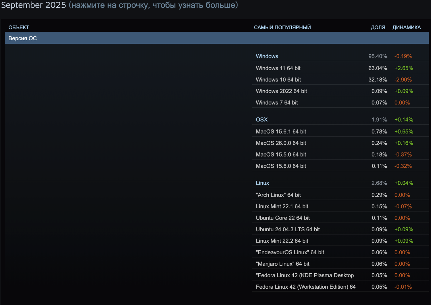 В контексте распределения операционных систем в сентябре, Windows сохраняет доминирующее положение с 95.4% от общей базы пользователей Steam, в то время как macOS занимает 1.91%.