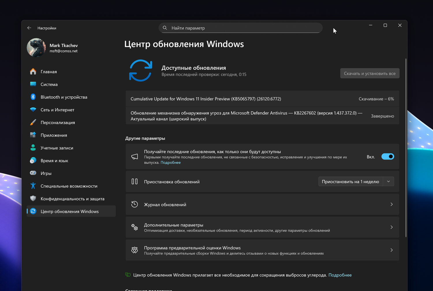 Перейдите в меню Параметры > Центр обновления Windows и нажмите Проверить наличие обновлений. Для завершения установки потребуется перезагрузка компьютера.