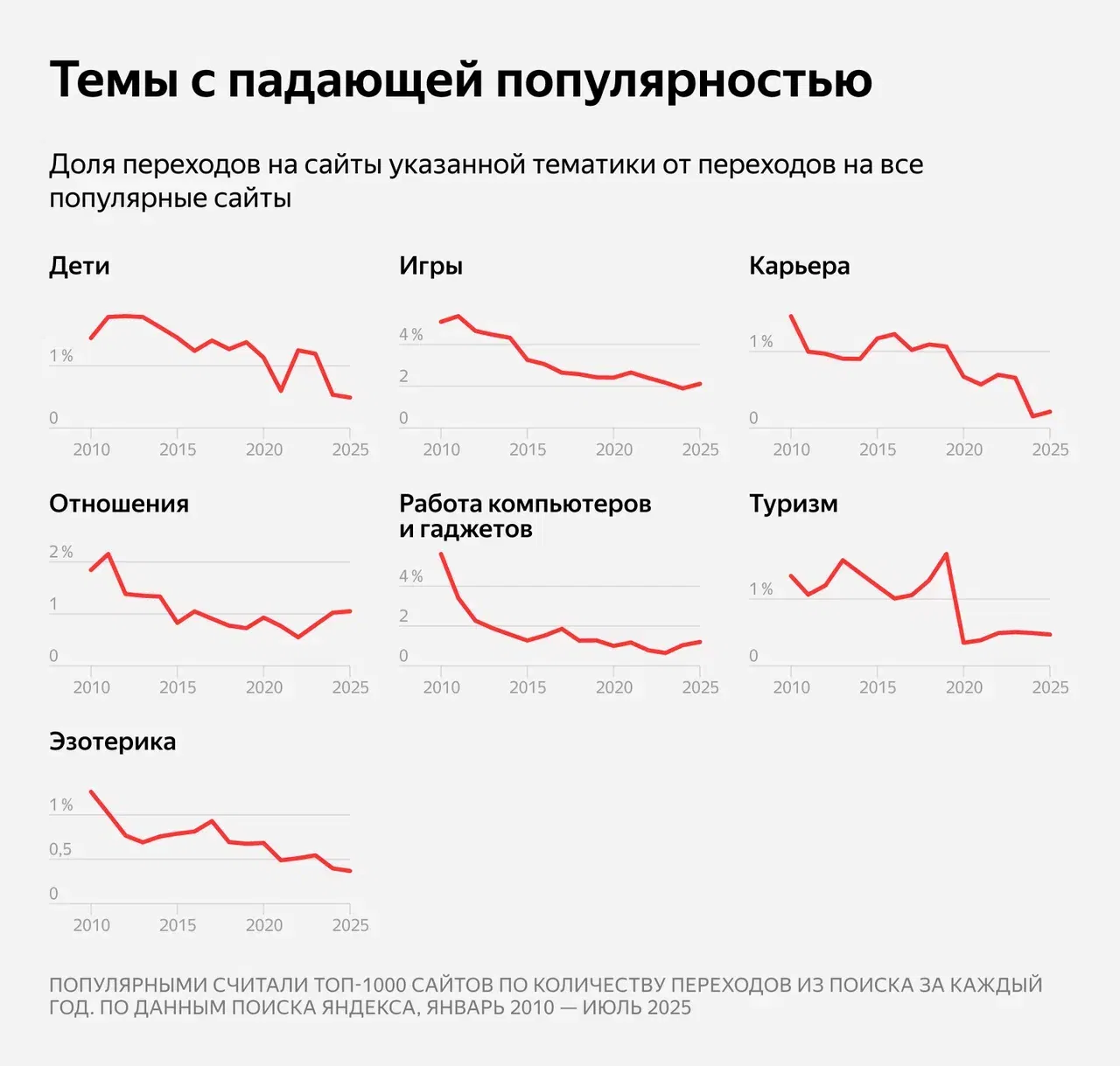 Аналитики Яндекса учитывали по 1000 сайтов с наибольшим числом переходов из Поиска за каждый год с января 2010 по июль 2025. Тематика каждого ресурса определялась вручную — на основе поисковых запросов, по которым пользователи переходили на сайт, а также по содержанию самого сайта.