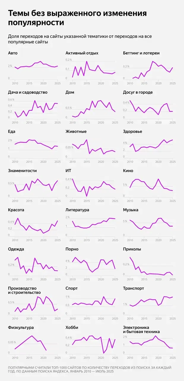 К темам со стабильным интересом относятся «Авто», «Спорт» и «Развлечения» — они сохраняют свои позиции без заметных колебаний на протяжении последних 15 лет.