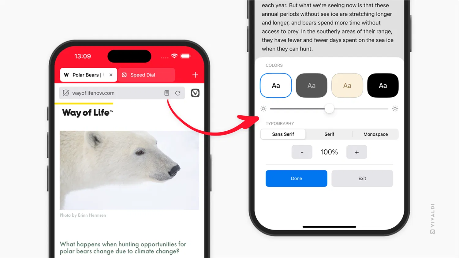 Вы сами управляете впечатлением от чтения. Подберите тему под освещение, настройте яркость, чтобы убрать блики, выберите шрифт, который приятно выглядит, и увеличьте размер текста, пока читать не станет по-настоящему удобно. Vivaldi запомнит ваши настройки — следующая статья откроется именно так, как вам нравится. Поздние новости, длинные репортажи, подборки рецептов или погружения в исследования — все становится проще, когда ничего не отвлекает.