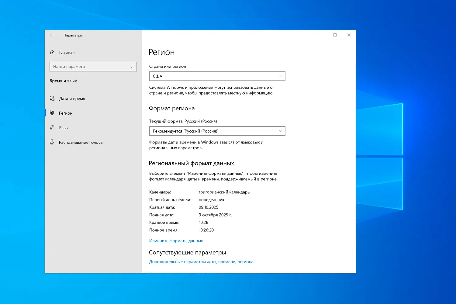 - Откройте Параметры > Время и язык > Регион и временно установите регион США или любую страну Европейской экономической зоны (например, Германия, Франция, Нидерланды).