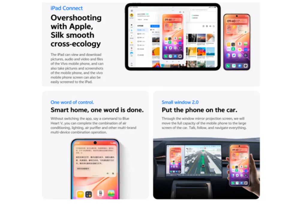 Vivo Office Suite обеспечивает передачу файлов между смартфонами, ПК и веб-платформами. Поддерживается работа с iPad: можно просматривать и загружать медиафайлы, а также транслировать экран смартфона. Через Xiao V стало возможным управлять умными устройствами, включая кондиционеры и очистители воздуха. Mirror Window 2.0 позволяет выводить интерфейс смартфона на экран автомобиля с поддержкой чата, навигации и мультимедиа.
