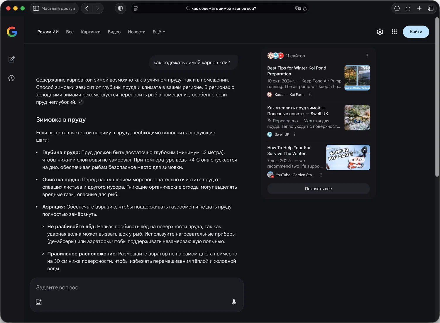 Например, на скриншоте ниже показан ответ Google в режиме ИИ на вопрос пользователя. ИИ сгенерировал развернутую сводку и отобразил ссылки на источники информации, позволяя сразу перейти к первоисточникам для проверки деталей. Видно, что интерфейс режима ИИ выглядит как чат: вопрос пользователя и ответ нейросети представлены в отдельной панели, тогда как классическая поисковая выдача остаётся доступна параллельно (во вкладке или области рядом).