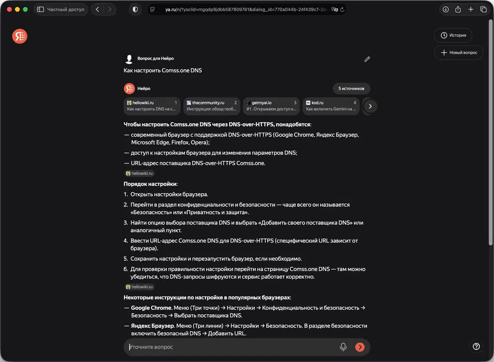 - Диалоговый режим уточнения запроса. После получения первого ответа пользователь вправе продолжить диалог с поисковым ИИ. Можно задавать дополнительные вопросы или переформулировать запрос – система учтёт предыдущий контекст и постарается уточнить или дополнить ответ. Это экономит время, позволяя не начинать поиск с нуля, если что-то осталось непонятным или требуется другая грань информации.