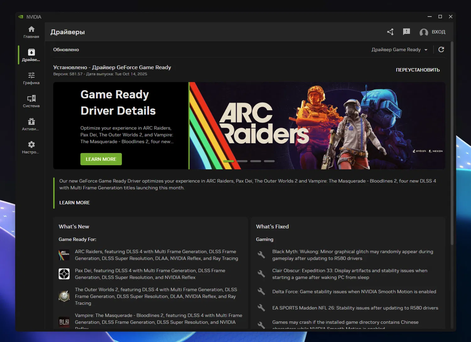 Версия 581.57 WHQL поставляется с поддержкой DLSS 4 и оптимизациями для игр ARC Raiders, Pax Dei, The Outer Worlds 2 и Vampire: The Masquerade — Bloodlines 2. Исправлены сбои со Steam Overlay, артефакты в Hell is Us и Warhammer III, ошибки в Black Myth: Wukong и Madden 26, а также проблемы с чёрным экраном на мониторе Alienware AW2524H.