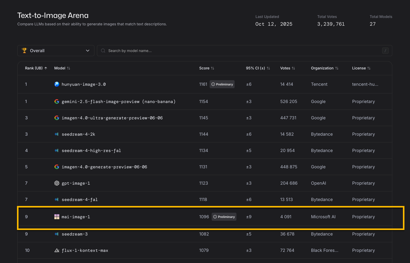 Кроме того, модель обрабатывает запросы и генерирует изображения быстрее, чем «более крупные и медленные модели». На платформе LMArena — сайте, где пользователи сравнивают изображения, созданные разными системами ИИ, и голосуют за лучшие — MAI-Image-1 уже вошел в десятку лидеров рейтинга.