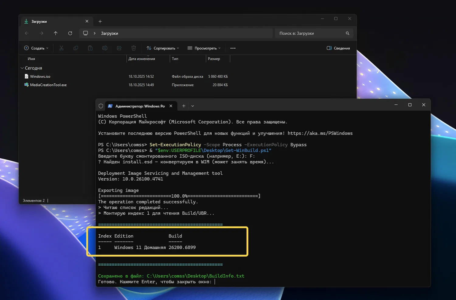- После завершения загрузки вы получите образ с Windows 11 25H2 (26200.6899).