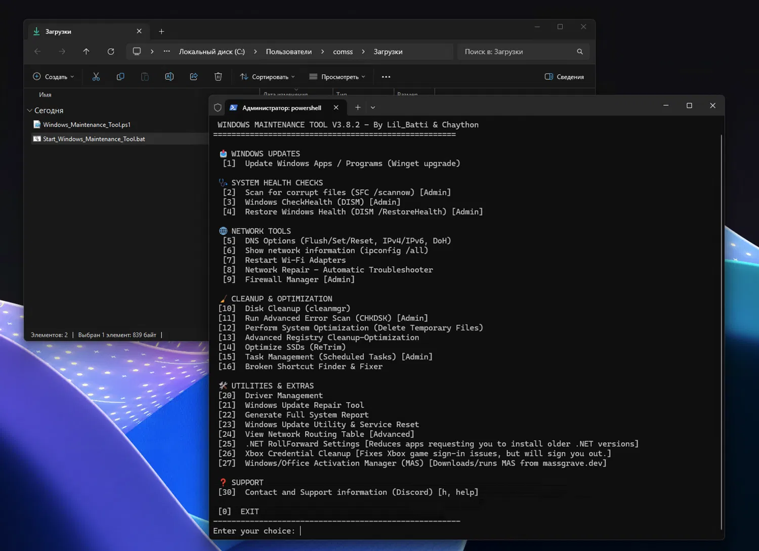 Как пользоваться: загрузите последнюю версию Windows Maintenance Tool (файл Start_Windows_Maintenance_Tool.bat и Windows_Maintenance_Tool.ps1) в одну папку и запустите .bat-файл от имени администратора. После этого откроется консольное меню: выберите нужную функцию, введя её номер и нажав Enter. Например, пункт «21» запускает встроенный мастер восстановления Центра обновления Windows, «23» – утилиту сброса компонентов обновлений. Результаты работы (отчёты и логи) скрипт сохраняет в текстовых файлах на рабочем столе. Поскольку Windows Maintenance Tool – сторонняя утилита, рекомендуется сначала проверить его работоспособность в виртуальной машине или на тестовом ПК.