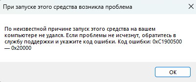 По неизвестной причине запуск этого средства на вашем компьютере не удался. Если проблемы не исчезнут, обратитесь в службу поддержки и укажите код ошибки. Код ошибки: 0xC1900500 – 0x20000