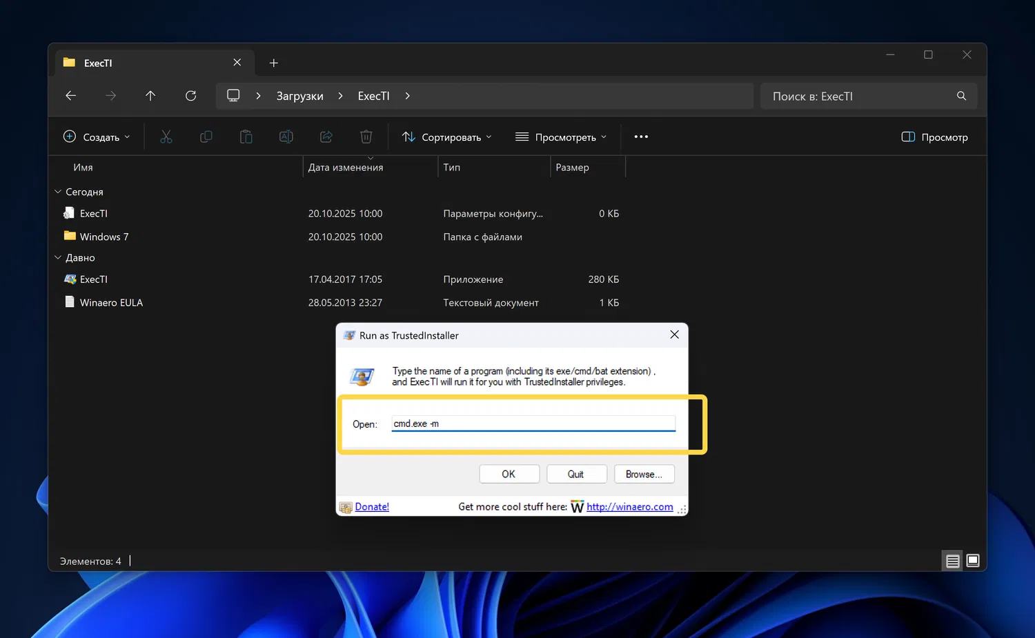 - Шаг 1. Скачайте утилиту ExecTI (Winaero) и распакуйте её в удобную папку (например, «Загрузки»). Эта программа позволяет запускать процессы с правами TrustedInstaller.